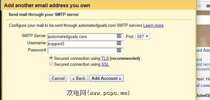 此操作在该窗口中,您将输入SMTP服务器地址,端口号以及该帐户的相应ID和密码,并选择正确的安全性选项。