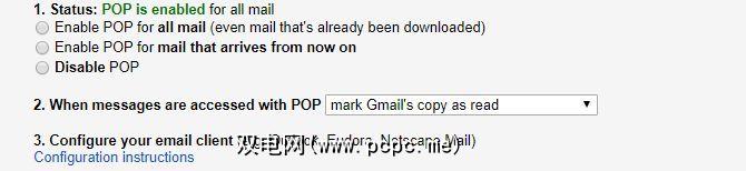 This is where you configure Gmail to either keep a copy of the original email, mark it as read, delete it, or archive it. If you click on Configuration instructions, you can read specific server and port settings to use when setting up your email client to obtain your Gmail emails.
