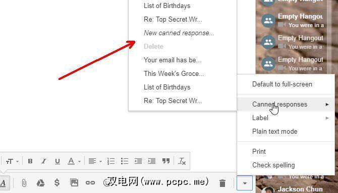 撰写邮件时一封新电子邮件,只需单击窗口右下方的下拉箭头,然后单击罐头回复。