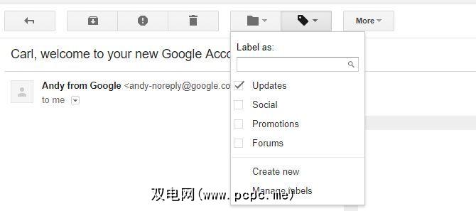 每当收到新的电子邮件时,都可以单击顶部菜单中的标签图标,并选择一个类别或为该电子邮件创建一个新类别。