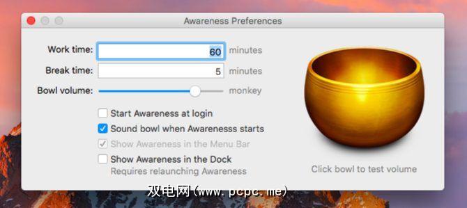 具有藏语般柔和的声音Awareness告诉您,您现在已经使用Mac了一个小时。如果您在过去一个小时中全神贯注于自己的工作(或者不理会Facebook和电子邮件),那将会产生很好的效果。休息一下或继续工作-由您决定。意识只是使者。