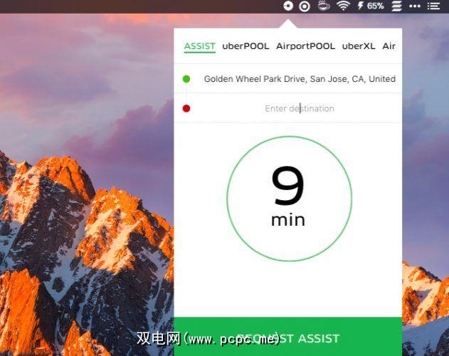 从菜单栏中预订Uber。使用应用程序中的自动完成建议,输入接送地点和目的地。