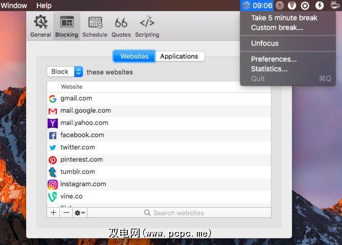 Mac有一些不错的第三方干扰阻止应用程序,例如SelfControl和Cold Turkey。很遗憾,基于菜单栏的解决方案(即Focus的竞争对手)似乎供不应求。