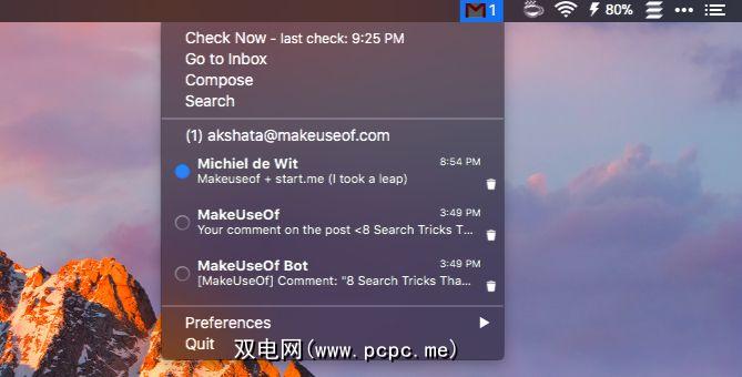 如果您希望使用类似Gmail的菜单栏应用程序,请尝试使用Made for Gmail或MailTab for Gmail。您是否知道用于检查非Gmail收件箱的任何最新菜单栏应用程序?