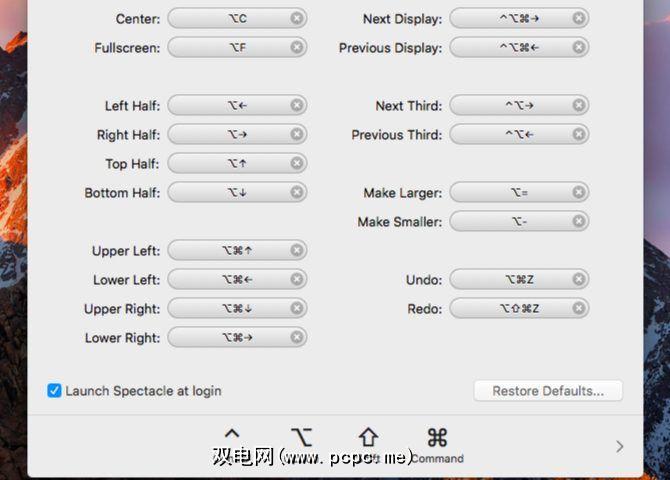 Spectacle可让您将窗口缩放到各种预设大小并将其移动到各种预设位置。您也可以在显示器之间移动它们,并按预设量缩放它们。您可以从应用程序的偏好设置中设置自定义键盘快捷键。