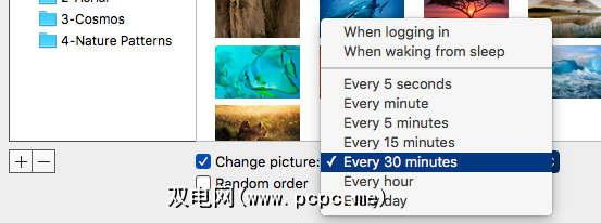 在墙纸窗口中,查看底部,您会看到 “更改图片"。确定时间间隔(很遗憾,您无法指定自定义时间),以及是否希望它们以随机顺序显示。如果不是,它们将按照在框中显示的顺序显示。