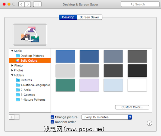 如果下拉“ Apple"菜单,您将在“ 桌面图片"下看到"的51张“官方"壁纸。要安装一个,只需单击它,桌面将立即更改。与纯色相同。可以选择一种预设的颜色,也可以通过选择“自定义颜色"来选择色轮,从而获得其原子橘色。