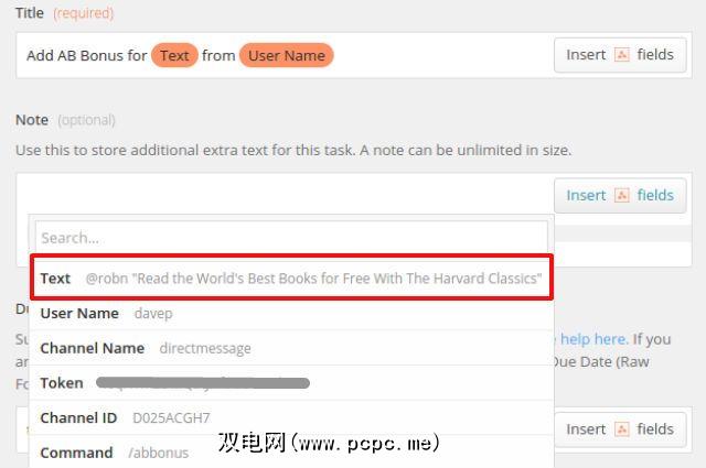 实际上,如果您向上滚动再次在第5步中设置ToDoist字段,您会注意到,当您单击``插入字段''时,Zapier现在会显示Slack命令已发送的所有数据。如您所见,命令之后的“ Text"参数被Zapier传递并识别。