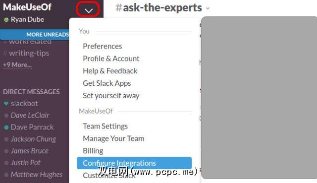 First, take a look at your Slack Integrations area by clicking on the down arrow next to your Slack community name, and choosing Configure Integrations from the list.