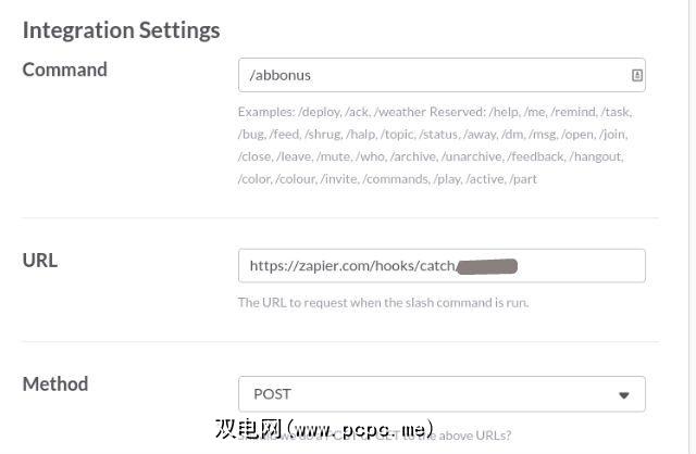 首先,只需命名命令即可。就我而言,我将其称为“ / abbonus "。人们将输入此命令来触发您的集成。下一行(URL)是最重要的一行。在GET或POST之间进行选择也很重要;因为它取决于您尝试使用自定义命令触发的服务。