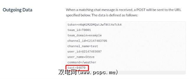 使用POST方法,Slack会将这些信息发送给外部服务使用“文本"变量,如下所示: