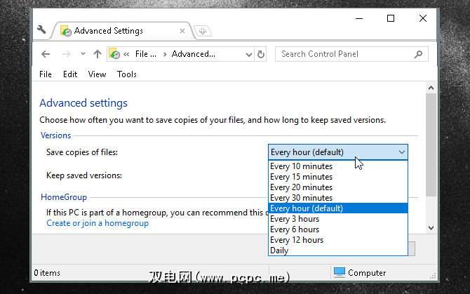打开文件历史记录之前,单击高级设置并设置您的首选计划。