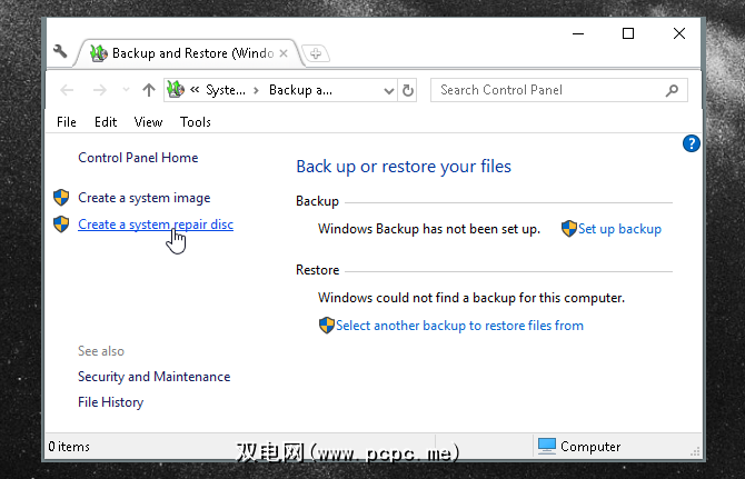 除了创建恢复拇指驱动器外,Windows 10还允许您创建恢复CD来备份PC。要打开此选项,请开始,搜索备份和还原,然后选择备份和还原(Windows 7)。 ,您可以选择在窗口的左侧创建系统修复光盘。请注意,这需要CD / DVD驱动器。