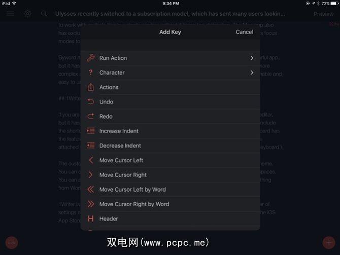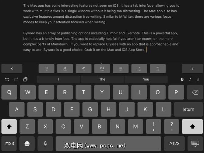如果仅在iOS上使用Ulysses,则可能会喜欢1Writer。它是仅iOS的编辑器,但对于高级用户来说,它具有大量功能。您只能编辑扩展键盘以包括所需的所有快捷键。这样可以确保您的屏幕键盘仅显示您实际使用的功能。
