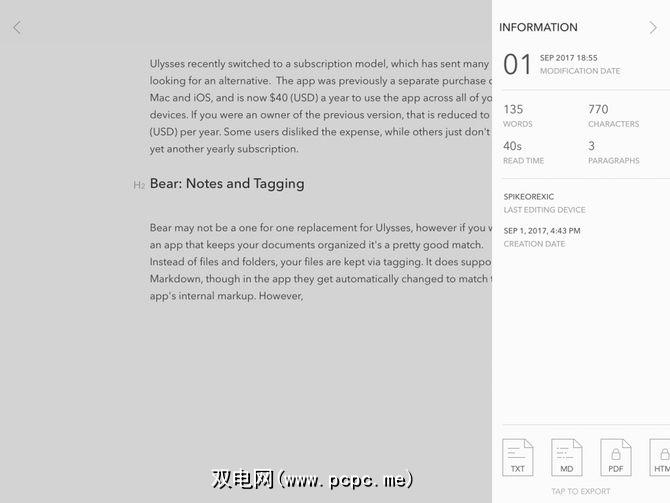 它确实支持Markdown,但是Bear会自动更改它以匹配应用程序的内部标记。例如,标题的##更改为H2。将其导出为.MD或.TXT文件后,应用的Markdown便会保留在该位置。公平地说,尤利西斯(Ulysses)也以非常规的方式处理Markdown链接。