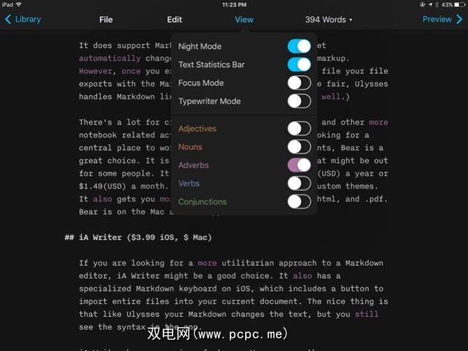 iA Writer具有一些独特的功能。该应用程序可以突出显示您使用的任何语言的不同部分。这使您可以找出文本中有多少副词,连词和其他形式的语音。它还有两种不同的免干扰模式:打字机模式,可将您当前的行保持在屏幕中央;以及焦点模式,它将使您当前句子以外的所有内容灰显。