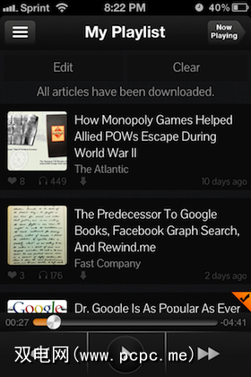要将文章添加到播放列表,请双击该故事,它将被添加,使其可用进行离线收听。将文章添加到播放列表后首次访问播放列表时,可以选择自动下载文章以进行离线收听。如果您选择不自动下载文章,则可以随时在以后的应用程序设置中打开此选项,并将下载限制为仅限WiFi连接。