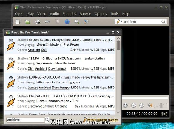 您可能已经注意到,右上角的小搜索框UMPlayer窗口中的许多屏幕截图。这可用于在YouTube和Winamp的Shoutcast服务中搜索流式视频和广播电台。尽管YouTube在我的Ubuntu笔记本电脑上有点不稳定,但Shoutcast仍然可以正常工作。
