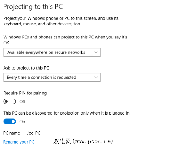 到首先,在将要接收投影的计算机上,按 Windows键+ I 打开“设置",然后导航到“系统">“投影到此PC" 。在第一个下拉菜单中,选择在安全网络上随处可见。您可以保留其他选项,也可以根据自己的喜好进行调整。