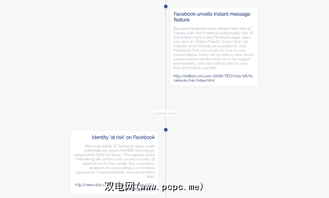 时间轴上的每个项目都是标语牌,上面有标题,相关信息的简短描述或摘录以及原始来源的链接。从2005年11月到2019年6月,您将看到Facebook的发展以及它如何突破隐私边界。
