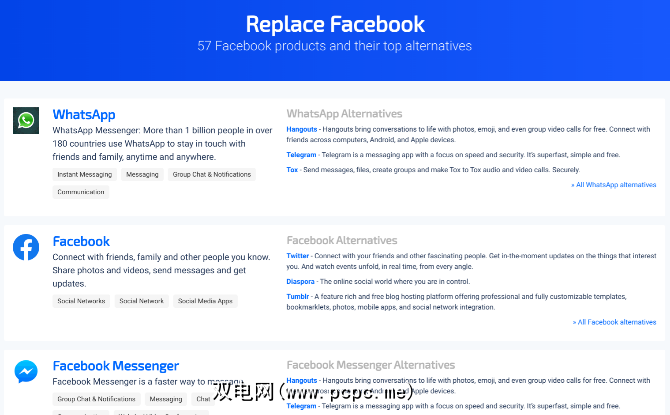 4。用SaaSHub(Web)替代Facebook:每个Facebook应用程序的替代方案