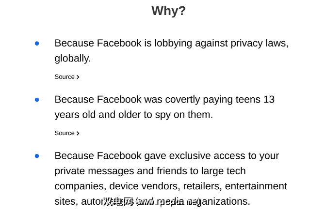 每个观点都得到了与知名消息源的链接的有力支持。例如新闻媒体,分析师或事实检查员。然后,埃尔南德斯列出了“如何"退出Facebook,并按照Ethical.net的建议为流行的Facebook应用提供了替代方案。
