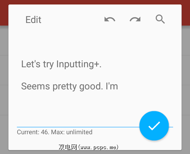 输入运行后,您会在键盘附近看到一个蓝色的浮动小图标。该应用程序会跟踪您键入的所有内容以及您编辑的所有内容。一切都在后台发生,您无需担心,直到您真正需要撤消/重做您所写的内容为止。在这种情况下,请点按浮动图标,然后Inputing +会显示为弹出窗口。