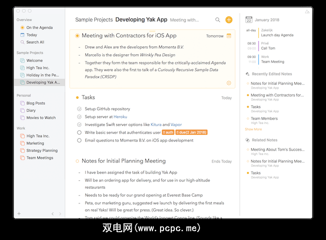 谈到时间表,Agenda甚至可以与日历集成并检测与该日历相关的其他笔记。您当前正在处理,因此在注释之间来回引用很容易。议程将笔记,任务管理和日历结合在一起,因此您可以了解现在和将来的情况。