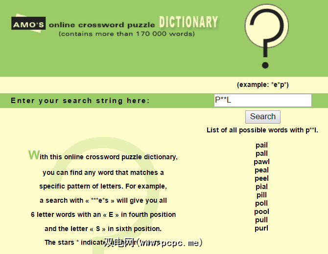 卡在填字游戏中可能会加重您的负担,如果您是这种类型的粉丝,您知道这一点。 Amo的在线填字游戏词典可让您根据字母模式查找单词。假设您需要一个四个字母的单词,第一个字母为 P ,最后一个字母为 L 。只需弹出 P ** L 并查看可能的单词。