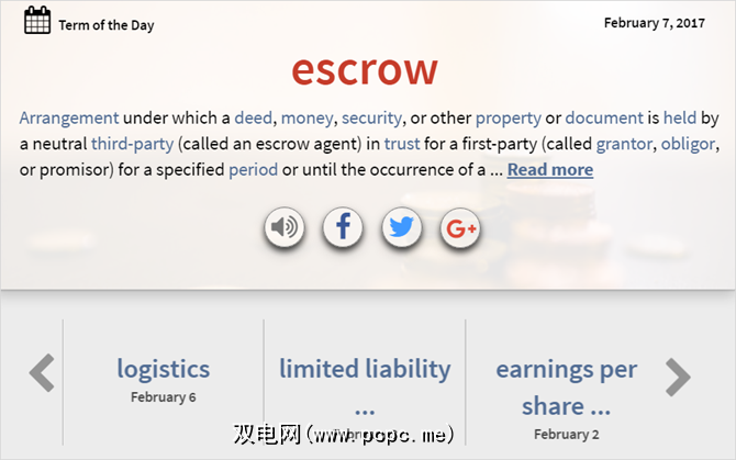 BusinessDictionary的另一个功能是您可以获取“当日术语",并具有滚动选项通过前几天。另外,常用术语显示在主页上。这些是扩展业务词汇的好方法。该站点涵盖管理,金融,商业,银行和小型企业。
