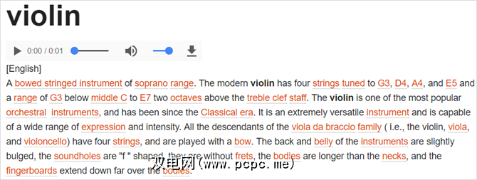 除了定义之外,您还可以收听音频发音。而且,对于某些项目,您可以听到歌曲示例。例如,小提琴的结果为您提供了一些歌曲样本,您可以收听或下载,例如D大调的贝多芬的 Serenade 。
