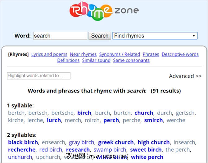 对于歌曲作者,诗人以及需要押韵单词的人,押韵区域是您想要的工具。只需输入要用作韵母的单词,单击搜索,然后查看结果即可。该网站提供大量押韵单词和短语,并以音节计数分隔。因此,如果您需要一个带有小胡子押韵的七个音节的短语,就可以理解。