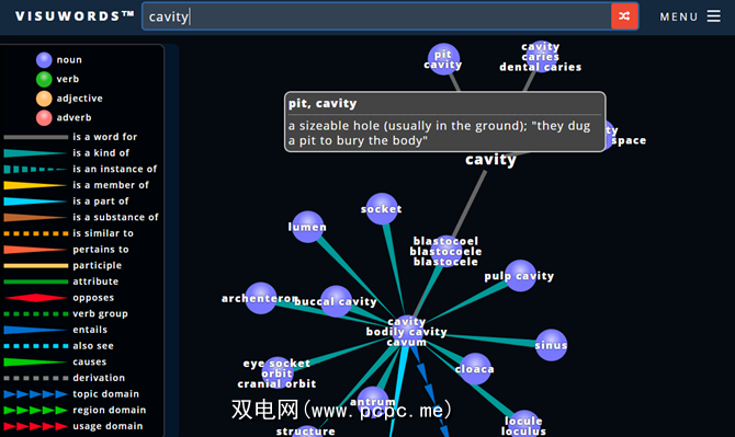 您可以将鼠标移到每个节点上以显示定义,并且有一个有用的键可以显示你的颜色和符号是什么意思。 Visuwords是一个非常酷的词典工具,但确实需要强大的Internet连接,因此请记住这一点。