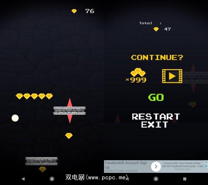 击中尖峰,您将丧生。这将使您在陷入困境之前不久就回来,但请注意。当您达到三峰值时,游戏就结束了。您可以继续,但是要付出高昂的代价。希望您一直在收集宝石,因为需要999颗宝石才能继续。
