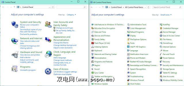 控制面板包含一系列小程序,可让您调整计算机的设置。默认情况下,您将看到类别视图。要更全面地查看所有小程序,请通过右上角的查看方式:菜单切换为大图标或小图标显示。小程序的确切选择取决于您的硬件和Windows版本。本文中的屏幕截图是在Windows 10技术预览版(TP)中制作的。