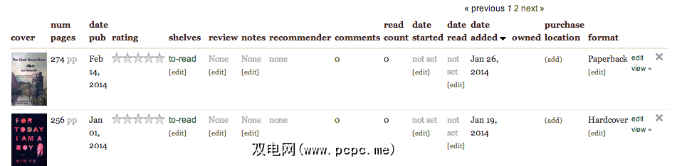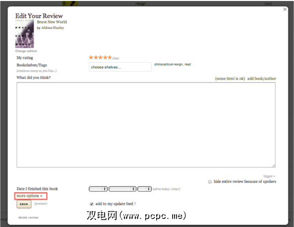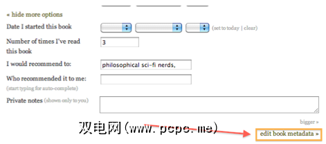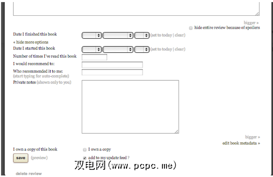 开始日期:您开始读书的日期。 阅读次数:我读过的次数。 我建议:建议读者的类型。这是一个没有限制的开放文本框。此处不是您向特定朋友推荐书的地方。 谁向我推荐了书:键入Goodreads用户(如果适用),以将其页面链接到您的评论。非Goodreads用户和摘要答案也可以插入此插槽。 私人注释:您自己的评论。没有其他用户可以阅读。 拥有副本:选中此框表示您不喜欢本书。 更新供稿:如果选中,则将显示您的书评或书评编辑 编辑图书元数据:此链接可链接到有关图书内容的分析信息。 顺便说一句,当您完成本手册时,请记住对Goodreads进行评论!