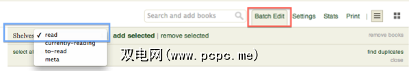 第一步:单击页面左侧的“批量编辑"按钮设置|统计信息|打印。 第二步:每本书封面的左侧都有一个可点击的小灰色方块。选择要搁置的所有书籍。 第三步:在书皮上方但在批量编辑链接下方有一个下拉菜单。单击它,然后选择要将所有选定的书归入其中的书架。 第四步:单击“添加选定的书"。此链接位于下拉菜单的右侧。 注意:要查找重复的图书,请点击“查找重复的图书"。将会出现同一本书的所有重复添加内容。要删除这些重复项,请全部选中,然后单击删除。