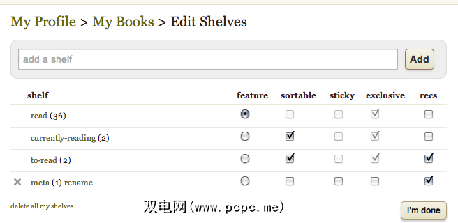 Goodreads的最大特色之一就是获得书房中我们摆放的整齐的书架,并将其变成有组织的数字艺术作品。为此,Goodreads提供了一系列的组织能力,包括货架,排序和元标记。