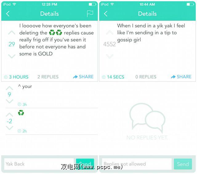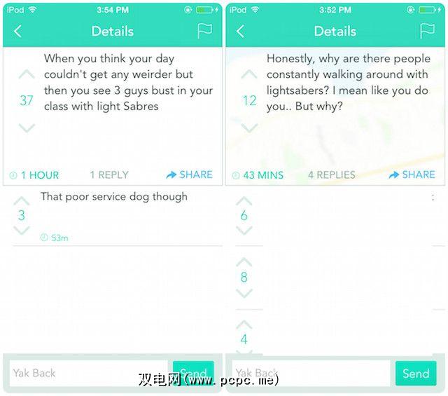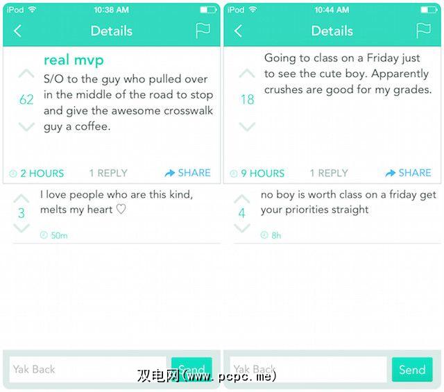 Yik Yak如此受欢迎的原因很多。该应用程序允许其所有用户发布短消息(或“ ya牛"),但仅显示用户半径10英里范围内的消息。同时,该地区的所有其他用户都有机会对自己喜欢的the牛进行投票,对不喜欢的牛进行投票,并用自己的想法对牛发表评论。提要在大多数位置都能快速移动,,牛很幸运能在十二个小时内保持可见状态。最近,Yik Yak添加了一项功能,该功能使用户可以“窥视"其他位置的Feed,但用户无法对这些Feed进行投票或评论。
