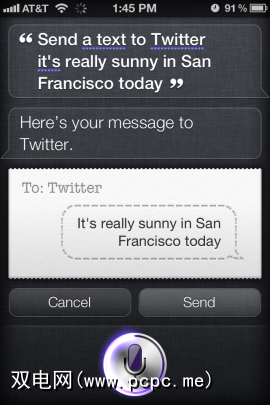 只需长时间激活Siri -按下iPhone上的“主页"按钮,告诉她通过推文“将文本发送到Twitter",或通过状态更新“将文本发送到Facebook"。确认消息后,您无需输入任何内容即可发布您的更新/推文。
