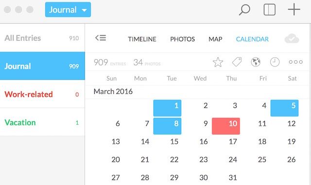 拥有多种颜色不同的日记,改变了我的写作方式。在第一天的第二天,我主要是在《个人》和《工作相关》这两种期刊之间整理思想。第三本杂志《度假》正在帮助我计划旅行。应用程序始终使用此划分。例如,可以通过地图或照片查看器过滤日记。