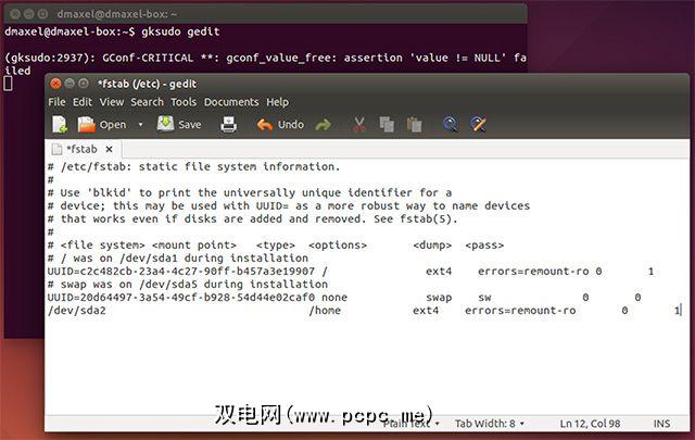 gksudo gedit 打开Gedit文本编辑器。现在,使用菜单打开位于第一个分区的/ etc / fstab中的文件。 / dev / sdXY / home ext4 errors = remount -ro 0 1 。再次,确保将 / dev / sdXY 替换为该分区的实际名称。结论