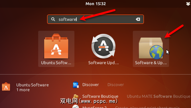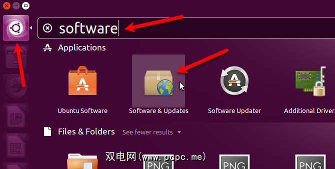单击Unity Launcher栏顶部的搜索您的计算机图标。开始在搜索框中输入“软件和更新"。然后,单击应用程序下的软件和更新图标。