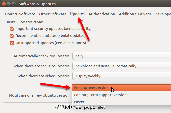 单击上的更新标签。软件和更新对话框。从通知我新的Ubuntu版本下拉列表中选择对于任何新版本。