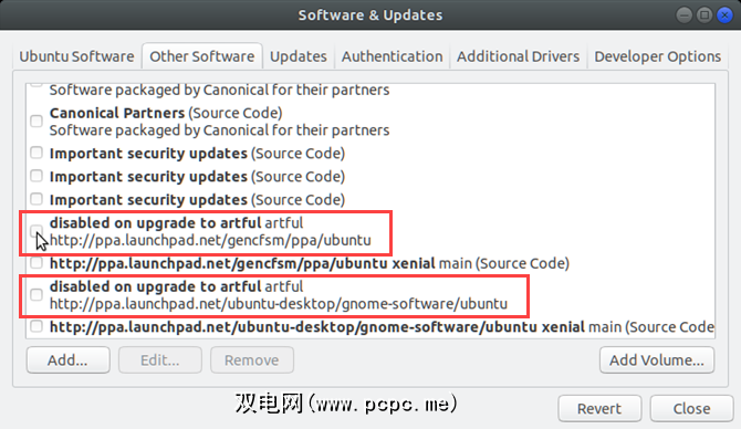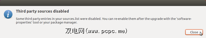 升级到新版本的Ubuntu时,一些第三方来源会禁用的。升级完成后,我们将在下面的“重新启用第三方来源"部分中向您显示如何重新启用它们。点击关闭以继续升级过程。