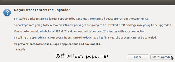 在获取新软件包之前,系统会询问您是否要开始升级。以下对话框说明了将删除,安装和升级的内容。它还会告诉您需要多少空间以及升级将花费多长时间。