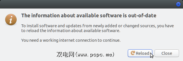 在软件和更新上单击关闭。对话框。出现以下对话框,您必须重新加载有关可用软件的信息,以便它是最新的。单击重新加载。