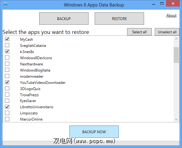 该过程与CloneApp相似。在现有的Windows 8安装上,首先更新所有Modern应用程序。然后下载并解压缩Windows 8 Apps数据备份,运行它,选择“备份",选择要保留的应用程序,单击“立即备份"。将整个文件夹复制到笔式驱动器。