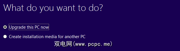 启动之后,将显示一个屏幕。选择第一个选项-立即升级此PC –,不选择第二个。了解?好的。