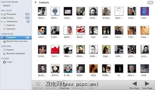上的菜单左侧允许您访问Flickr的各种功能-您的照片集,组,收藏,收藏夹和画廊。您可以通过双击打开每个视图(它们会在新窗口中打开),但是您无法打开您的收藏集(此功能仅对Flickr Pro用户可用)。该菜单还使您可以访问联系人列表和联系人的最新照片。